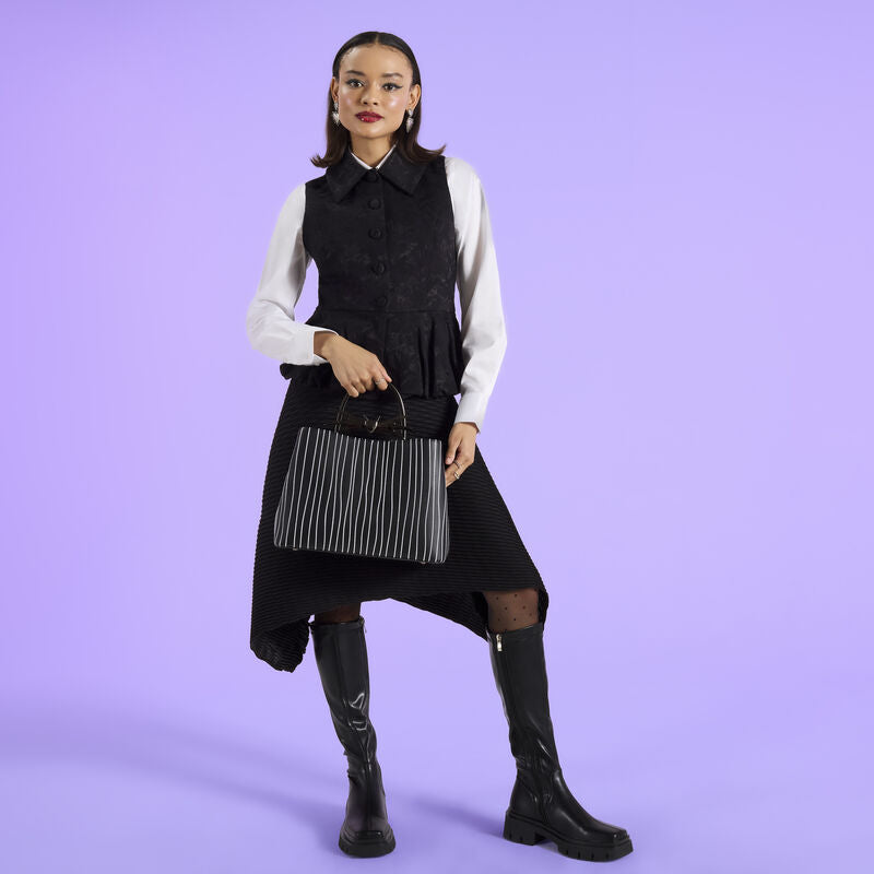 Ce sac à main est inspiré du costume de Jack Skellington, avec ses détails brodés représentant son costume à rayures. Une poignée en métal dépasse du haut et est ornée d'un nœud papillon chauve-souris sculpté en métal. Il brille dans le noir !