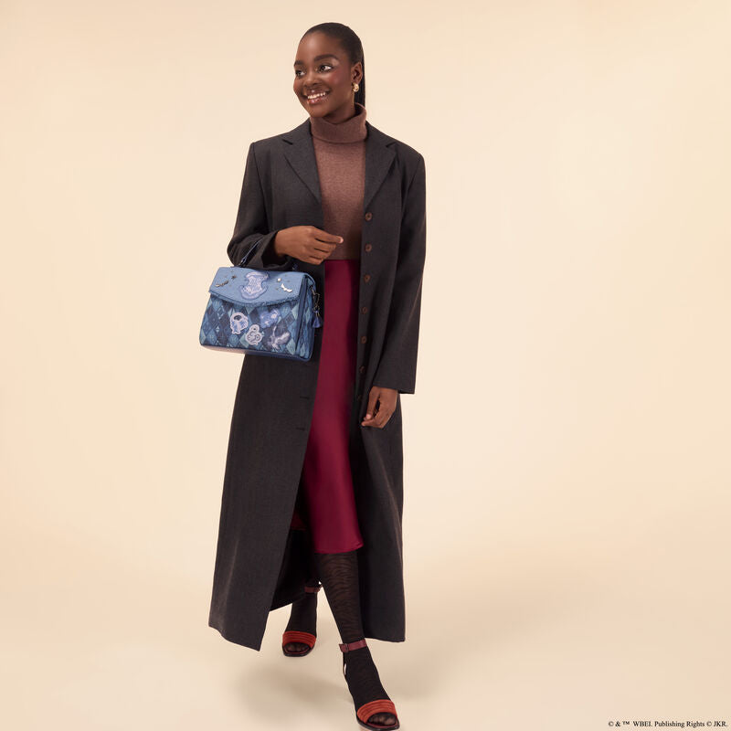 Ce sac bandoulière est orné d'un simili-jean, de breloques métalliques, de pompons et de franges ! Vous trouverez l'écusson de Poudlard™ sur le rabat supérieur. Le sac est orné d'un motif losanges bleu, avec des images de chaque animal de la maison de Poudlard™ !