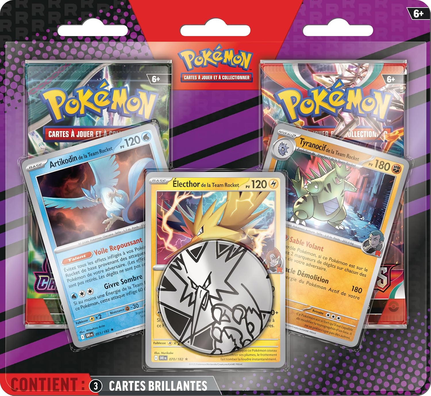 Ce blister amélioré Pokémon rassemble deux boosters officiels ainsi que trois cartes mettant en avant Artikodin, Électhor et Tyranocif dans un style inspiré de l’équipe Team Rocket. Ce format compact et apprécié des collectionneurs permet de profiter à la fois de cartes visuelles emblématiques et d’une ouverture de boosters variée.