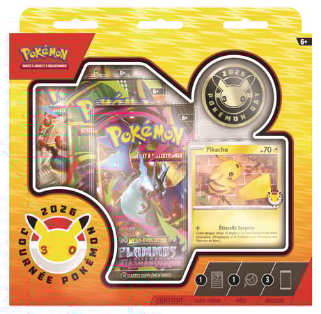 Célébrez les **30 ans de Pokémon** avec la Collection Journée Pokémon 2026 en version française du Jeu de Cartes à Collectionner Pokémon (Pokémon TCG). Ce coffret édition spéciale réunit une carte promo Pikachu exclusive, une pièce collector commémorative et trois boosters tirés de différentes extensions, offrant à la fois une expérience d’ouverture excitante et un contenu collector à conserver ou offrir.